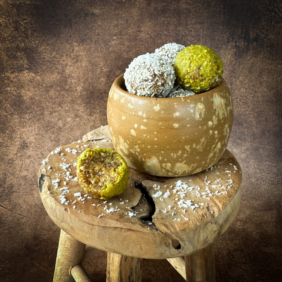 - Kokosflocken und gemahlene Pistazien zum Wälzen