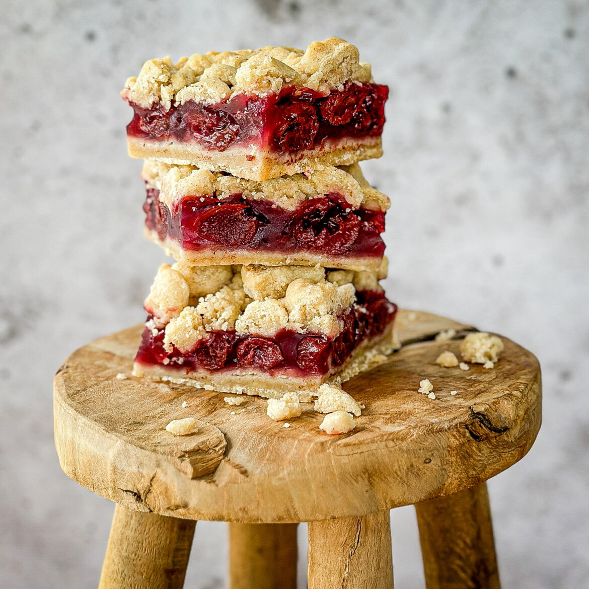 Die Kirschschnitten schmecken frisch am besten, halten sich aber gut abdeckt mehrere Tage. Sollte der Kuchen länger im Kühlschrank verbracht haben, am besten vor dem Servieren kurz in den Ofen geben oder rechtzeitig aus der Kühlung nehmen.