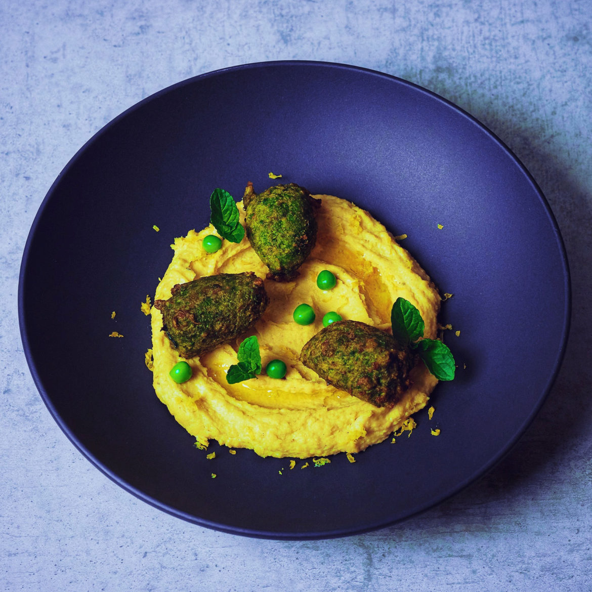 - Erbsenfalafel auf dem Zitronenhummus anrichten und den Humus optional mit ein wenig Zitronenöl beträufeln und etwas Zitronenzeste darüber reiben. Die übrigen Erbsen darüber geben und servieren.