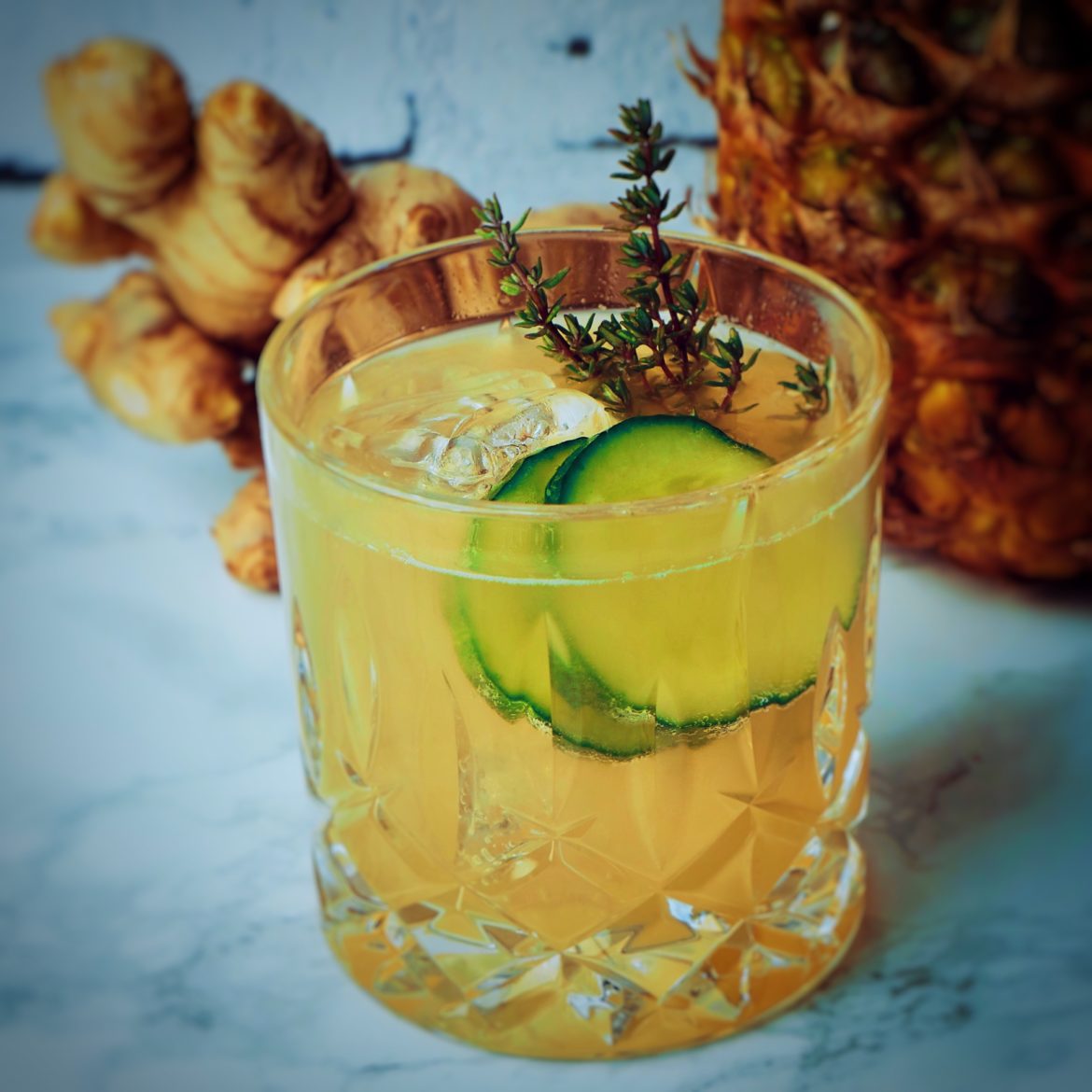 2 cl Zitronensaft Zitronensaft, Ingwersirup, Aperitivo Rosato, Ananassaft und Ginger Beer in das Glas geben. Das Ganze dann mit Soda aufgießen und Eiswürfel, Gurkenscheiben und Thymian in das Glas geben. Cheers! Die Mengenangaben bemessen sich an einem Aperitifglas mit 150ml Inhalt.