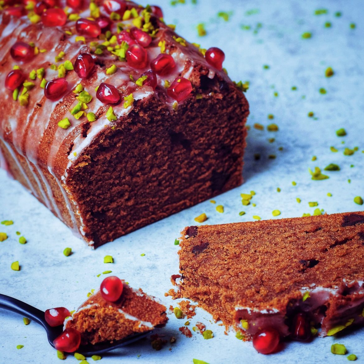- Sobald der Kuchen abgekühlt ist, den Puderzucker mit 1 EL Glühwein zu einem Guss verrühren und damit den Kuchen beträufeln. Zum Schluss mit gehackten Pistazien und Granatapfelkernen dekorieren.