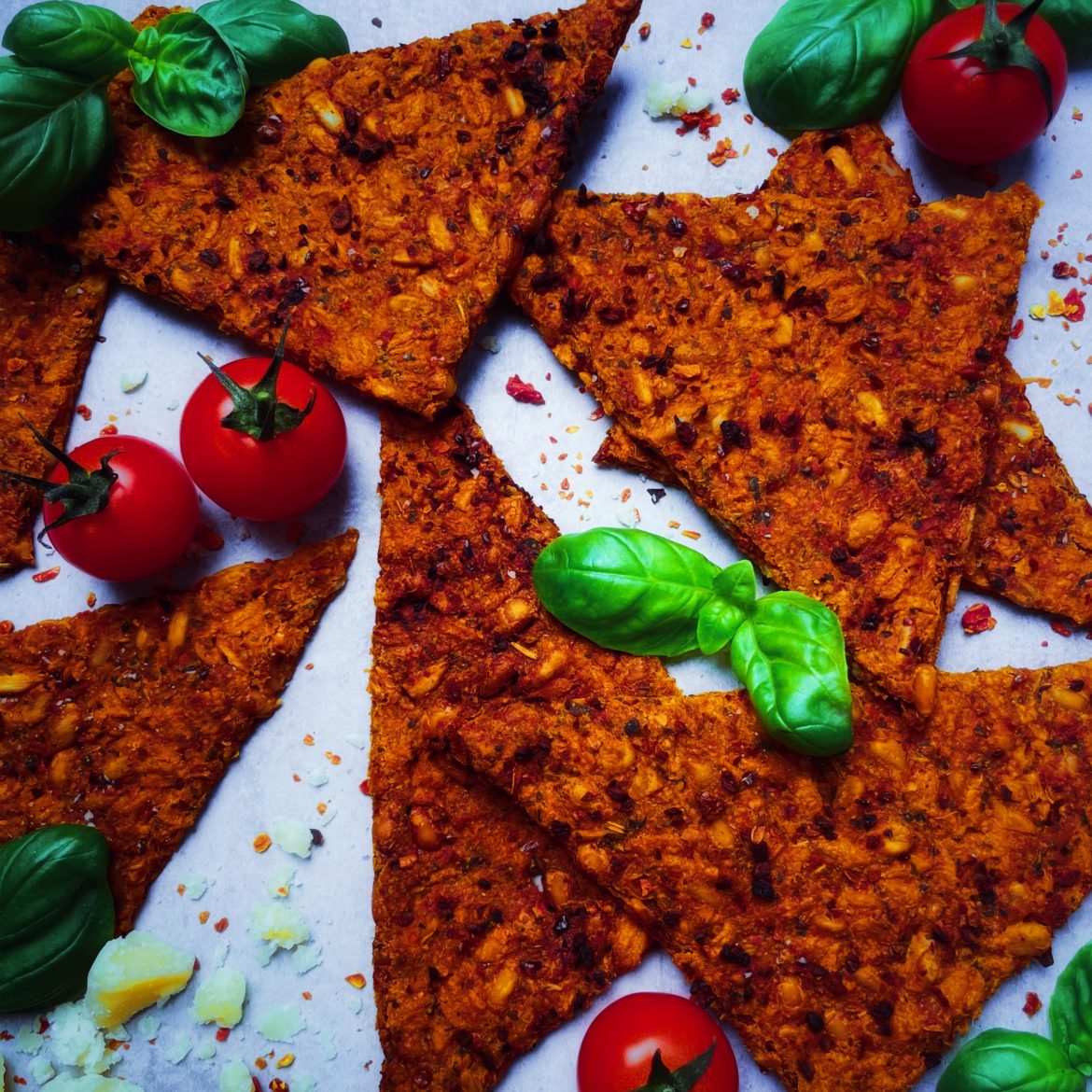 - Ein Backblech im vorgeheizten Ofen erst 15 Min. backen, dann kurz herausnehmen und mit einem Pizzaschneider in Stücke schneiden. Weitere 30-40 Min. backen, bis das Knäckebrot schön knusprig aussieht. Falls der Teig etwas ungleichmäßig aufgetragen wurde, können auch fertige Stücke früher aus dem Ofen genommen werden und bspw. dickere Mittelstücke noch etwas länger backen.