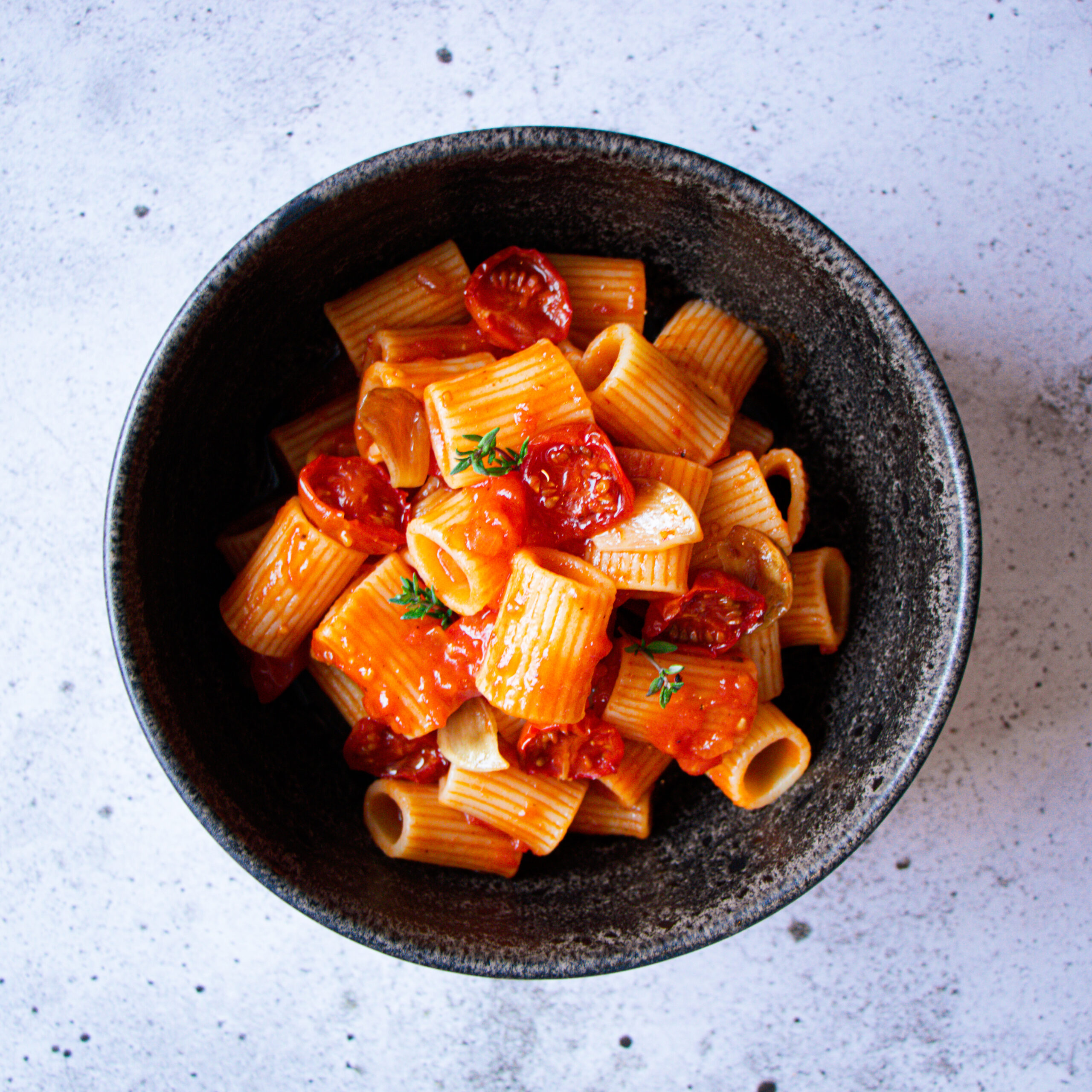 Der Twist bei der Geschichte ist, dass diese Sauce hauptsächlich aus frischen Tomaten besteht, die durch das vorherige Rösten im Ofen zusammen mit Knoblauch und Kräutern ihr volles Aroma entfalten und die Sauce erst zu dem machen, was sie ist: Frisch – Fruchtig – Würzig – Intensiv.