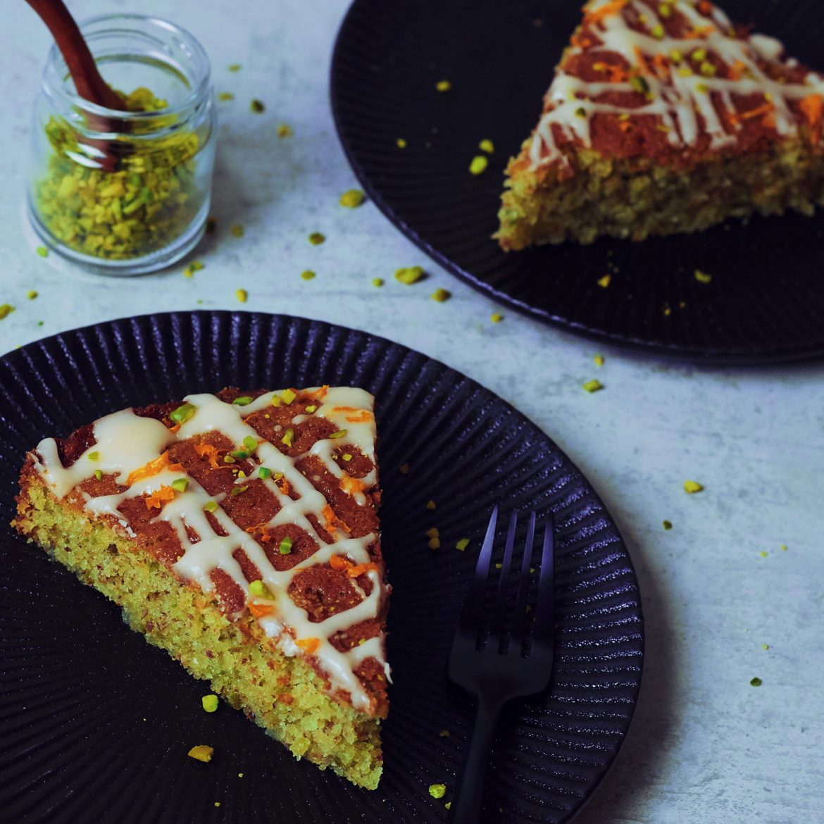 - Für die Glasur Orangensaft mit Puderzucker mischen, über den Kuchen geben und vor dem Servieren mit Pistazien und Orangenzesten dekorieren.