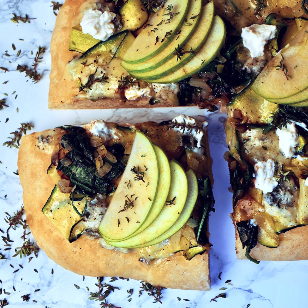 Wie aber kommen wir jetzt von der Pinsa auf die Pizza? – Natürlich durch eine Liste, wie dieses Kapitel schon vermuten lässt. Und zwar durch die der Schriftstellerin Susan Sontag, die in Listen niederschrieb, was sie mochte und was nicht. Haare waschen und duschen gehörte beispielsweise zu den Dingen, die sie nicht mochte, neben Sardellen und deutschem Essen. Rechnungen bezahlen und Fragen stellen hingegen schon, genau wie Pizza und grüne Äpfel. In Anlehnung an diese Liste widmet Nicole Giger der Schriftstellerin diese großartige Pinsa-inspirierte Pizza. Ich bin hin und weg von der Kombination aus Spinat, Zucchini, Gorgonzola und grünem Apfel.