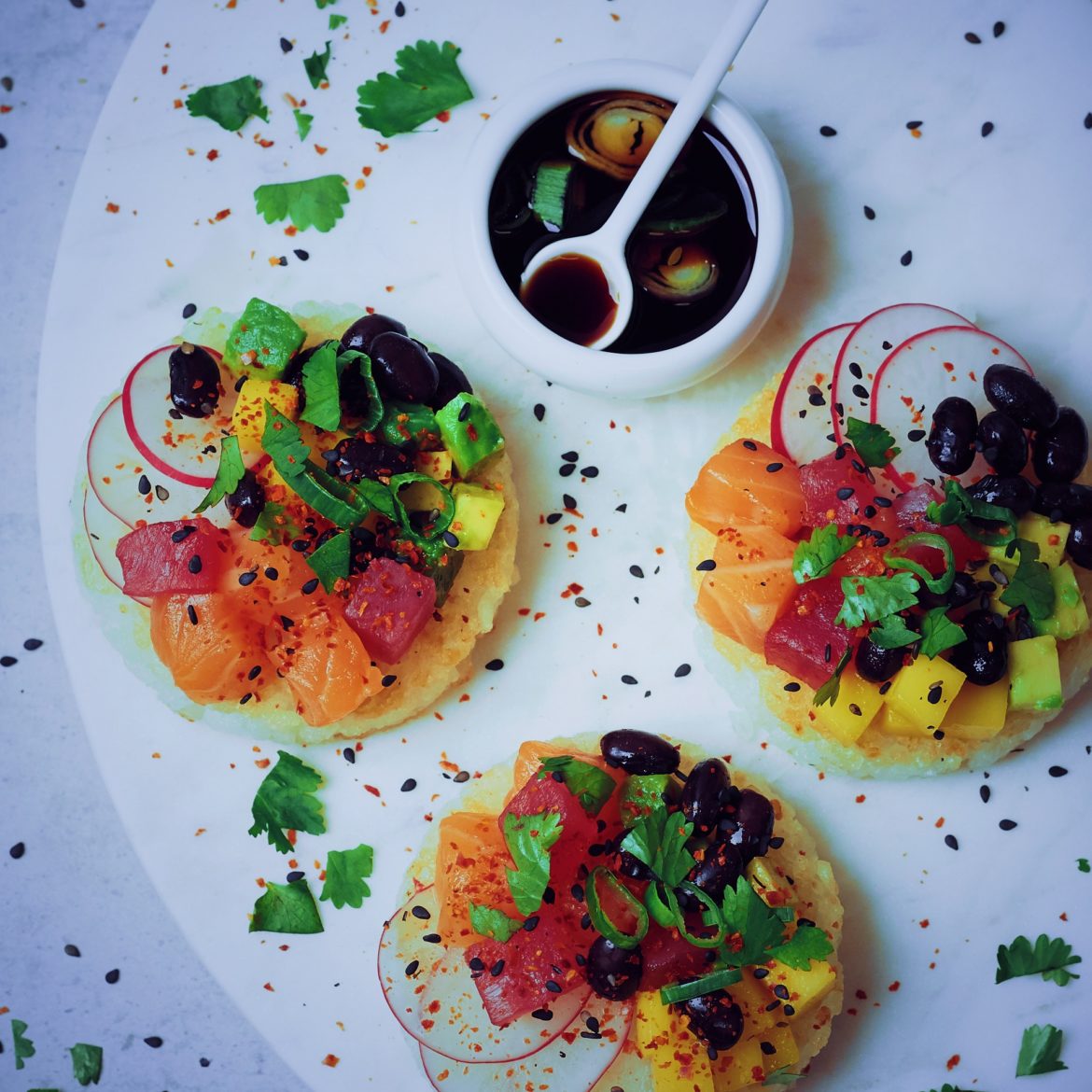 Diese Kreation erinnert an eine Hawaiianische Poke Bowl und natürlich auch an Sushi. Ich bin absolut gaflasht von der Idee, Klebreis zu formen, knusprig anzubraten und als Pizzaboden zu verarbeiten. Belegt mit super frischem Fisch, Mango, Avocado, Bohnen und Radieschen werden diese kleinen Pizzen zum sensationellen Soulfood, das JEDER der Sushi und Poke Bowl liebt, unbedingt probiert haben sollte. Abgerundet werden diese kleinen Kunstwerke durch Frühlingszwiebel, Koriander, schwarzen Sesam, Chili und Sojasauce.