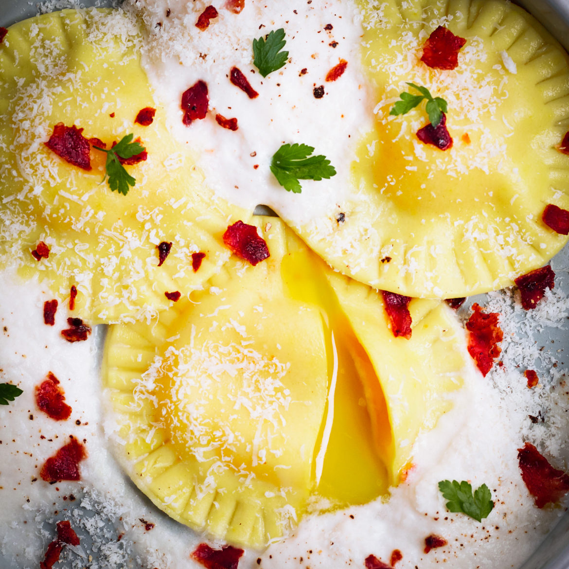 Heute geht es allerdings nicht um Eiweiß, sondern um Eigelb. Vielmehr um Eigelb, das sich in Ravioliteig eingenistet hat. Im Netz ist immer wieder von der „Königsdisziplin“ der Pasta die Rede. Das kann ich so schonmal nicht bestätigen. Ich bin der Meinung dass jeder der ein bisschen Fingerspitzengefühl und Geduld mitbringt, diese Ravioli zubereiten kann. Nach den meisten Rezepten gibt man das Eigelb in einen gespritzen Ring aus Ricotta, für mehr Stabilität und zum Schutz des Eigelbs. Das habe ich ausprobiert und auch direkt wieder sein gelassen. Das tut dem Ganzen geschmacklich aus meiner Sicht nichts gutes und ich habe wieder einmal bemerkt, dass für mich Ricotta generell nichts in einer Pasta zu suchen hat. Also habe ich mich schnell für ohne Ricotta und Eigelb pur entschieden.
