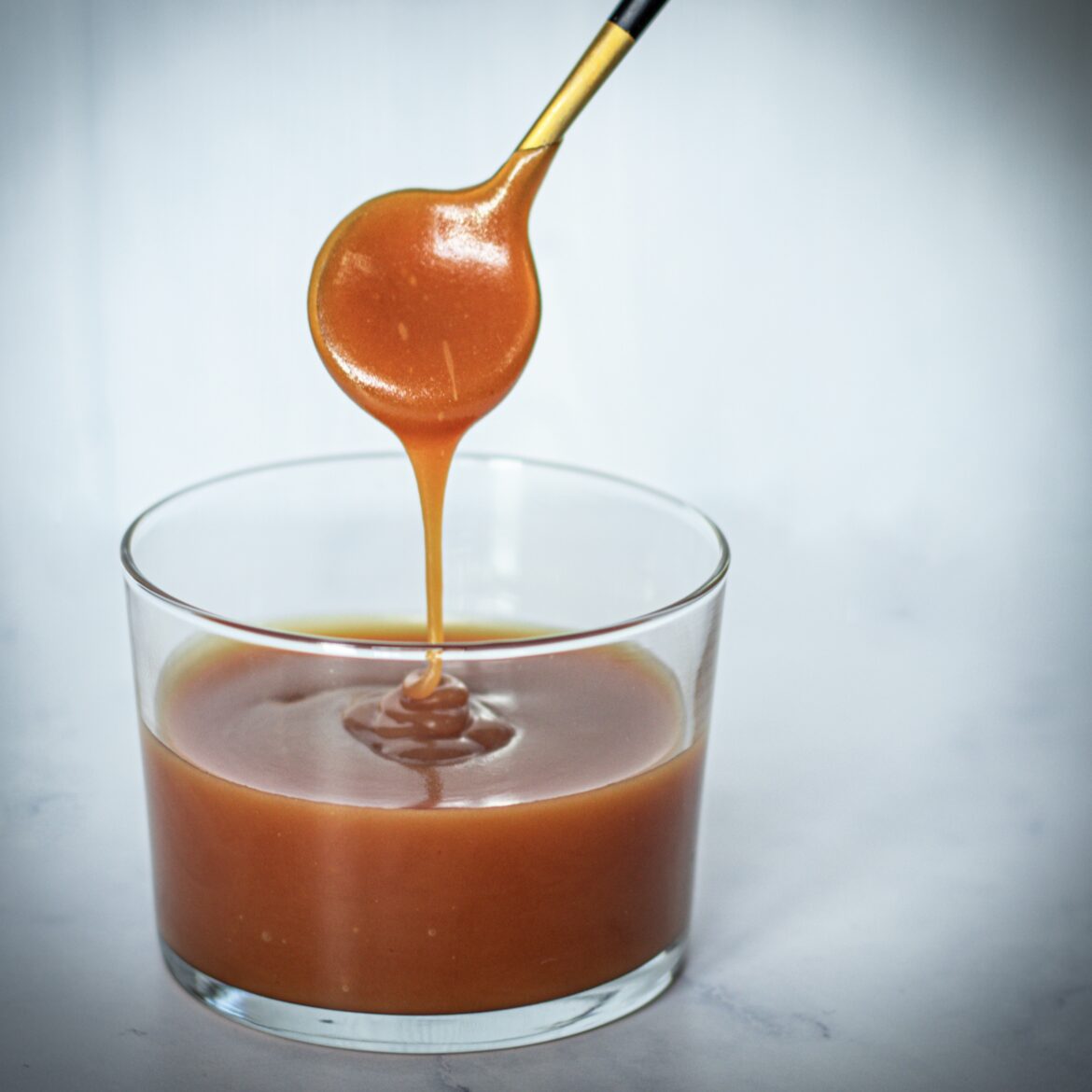 - Nun das Karamell in eine Squeeze Flasche oder ein verschließbares Glas füllen. Sofort weiterverarbeiten oder im Kühlschrank aufbewahren.