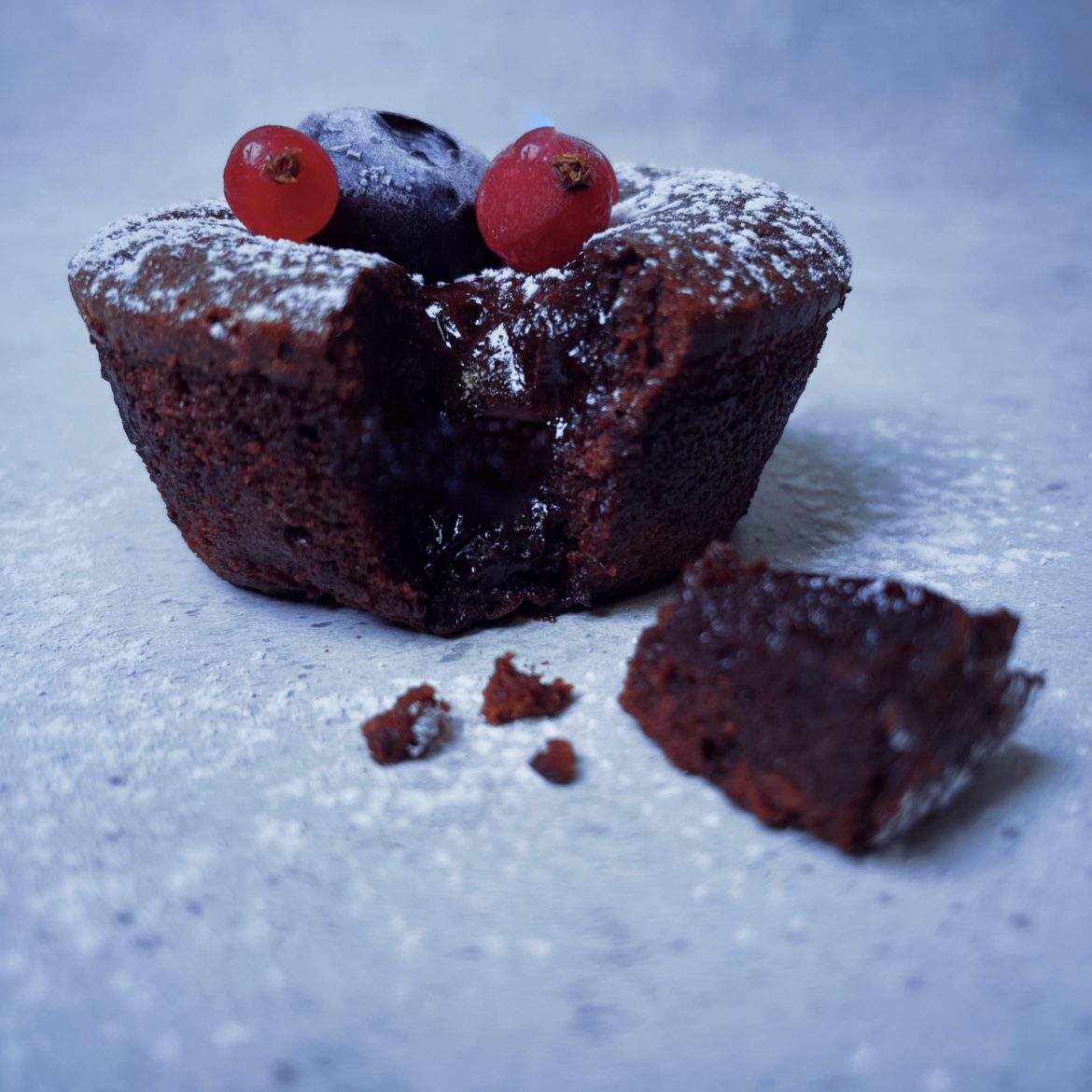 - Die Schokokuchen vorsichtig aus den Formen drücken. Mit Puderzucker bestäuben, mit Beeren toppen und noch warm servieren.