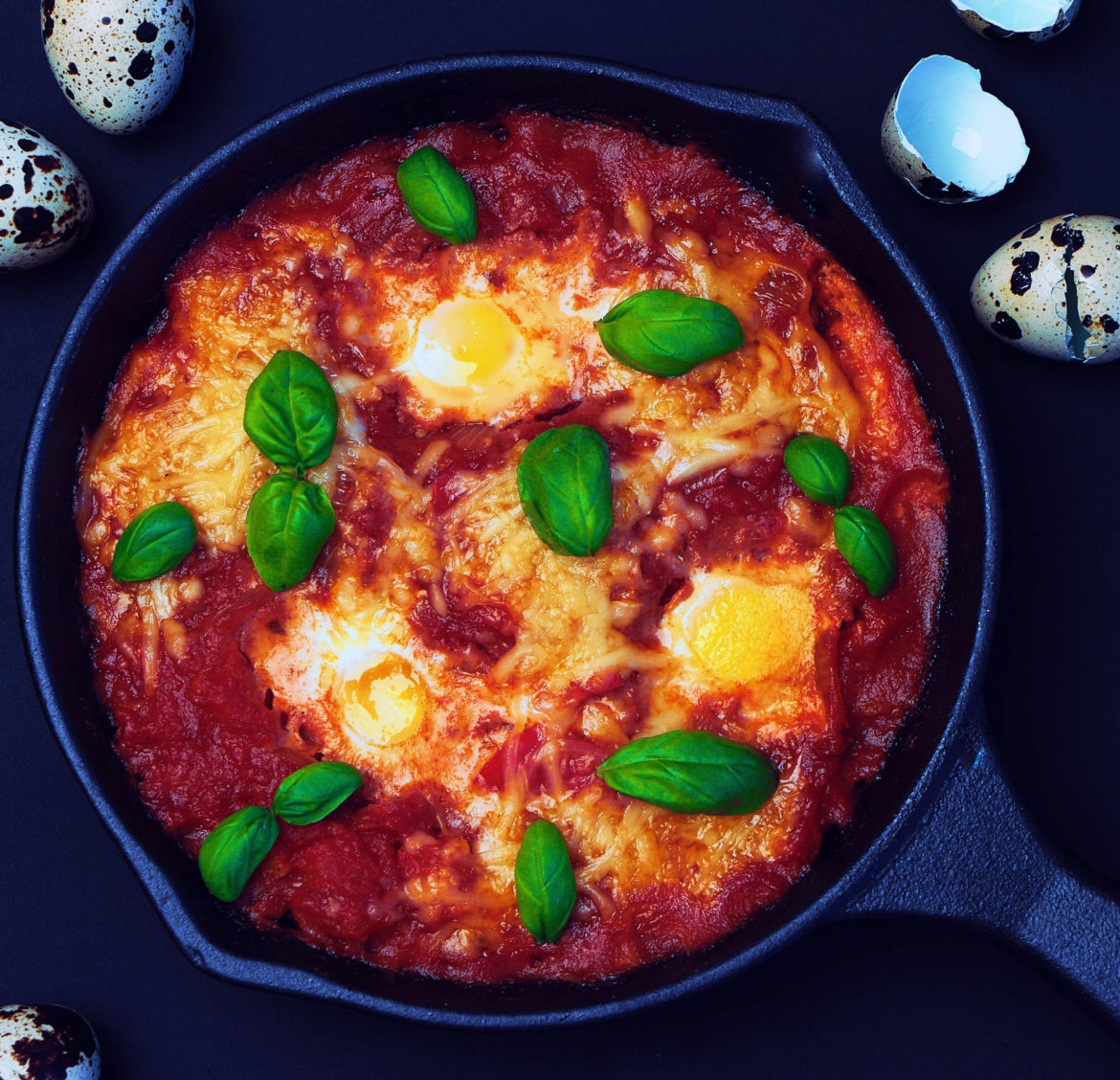 Ich habe hier ein Rezept kreiert, das es so noch nicht gegeben hat. Auf dem Markt habe ich Wachteleier, Basilikum und Bergkäse bekommen und mit diesen Zutaten rund um das Grundrezept der Shakshuka mein eigenes entwickelt. Und ich kann euch sagen, ich bin begeistert!