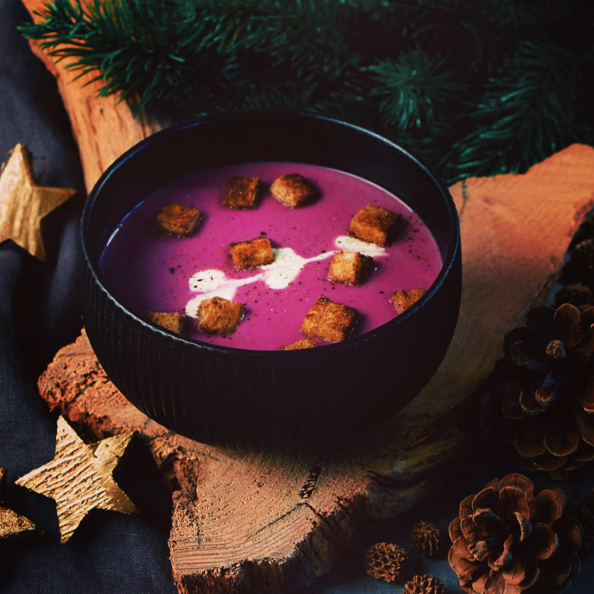 Noch dazu ist die fabelhafte Weihnachtssuppe farblich ein echtes Highlight. Rotkraut, bzw. Blaukraut kennt man ja traditionell hauptsächlich als typische Beilage zu Bratengerichten. Es ist also wirklich spannend, kreativ zu sein und das altbekannte Kraut neu zu interpretieren. Wer also noch nach Inspirationen für das Weihnachtsmenü sucht, sollte nicht zögern und sich unbedingt an dem Rezept versuchen.