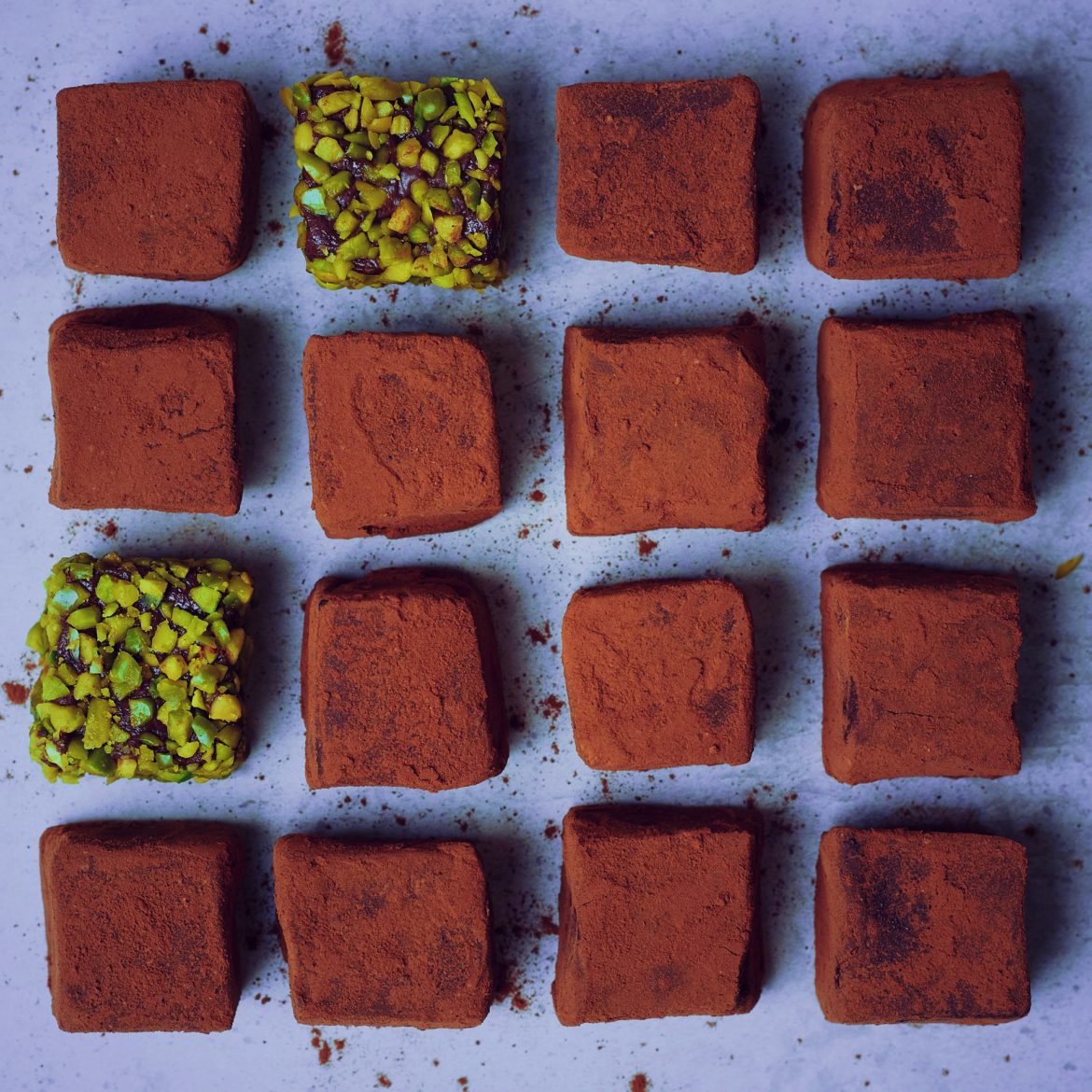5. Die Würfel in Kakao, bzw. gehackten Pistazien wälzen und im Kühlschrank aufbewahren.